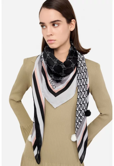 Шал с десен и помпони - Черен/Мръснобял