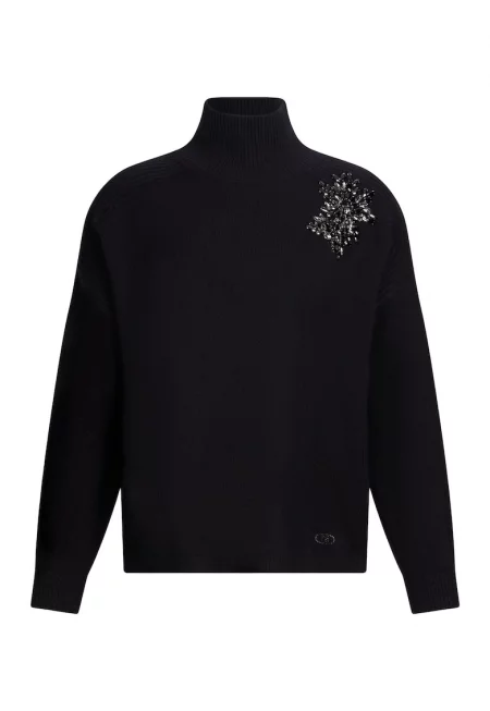 Вълнен пуловер с отвор и декоративни камъни - Черен