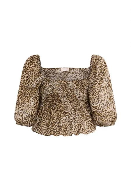 Къса блуза с бухнали ръкави и принт - Кафяв