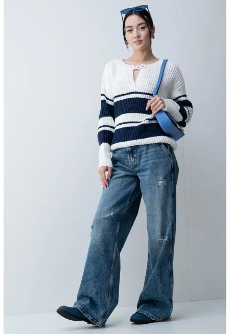 Пуловер с паднали ръкави - Бял/Тъмносин