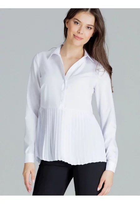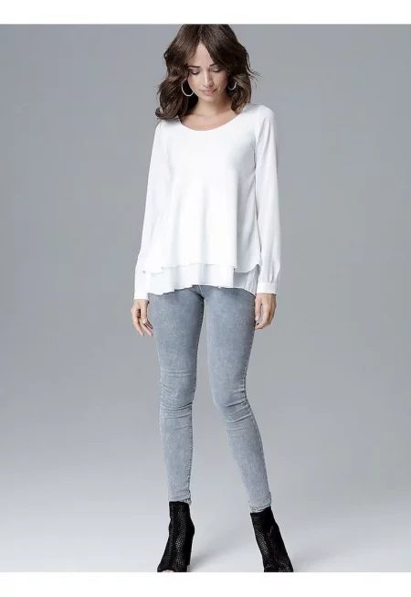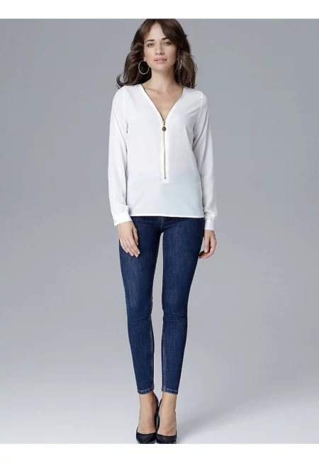 Дамска блуза - Ленитиф - бяла - дълъг ръкав - половин цип - полиестер