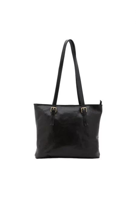 Кожена шопинг чанта с каишки с тока - Черен