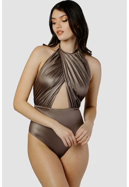 Цял бански с халтер деколте - Светлокафяв