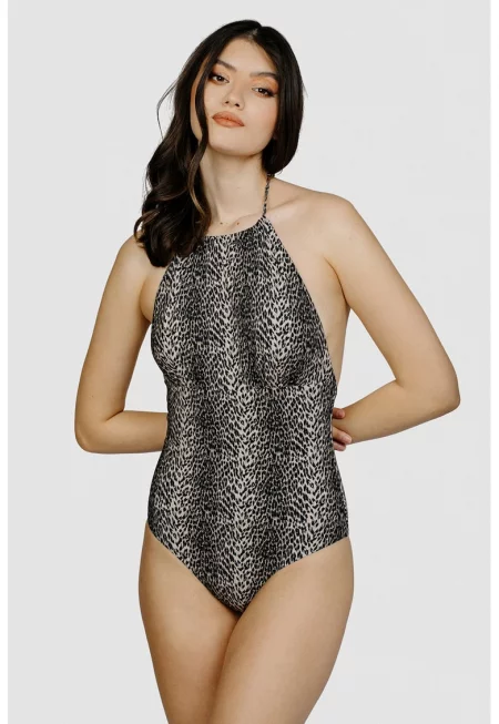 Цял бански с животинска шарка - Черен/Камел