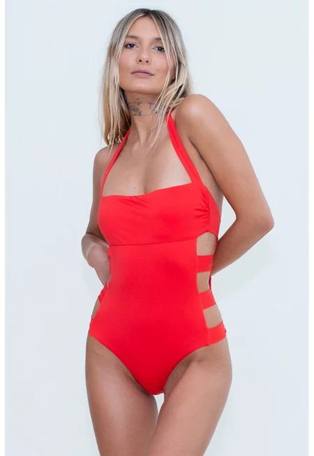 Цял бански със странични отвори - Аленочервен