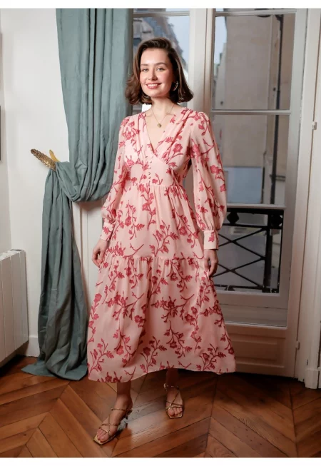 Разкроена рокля с флорален принт 4695D - розово 17076 - Розово