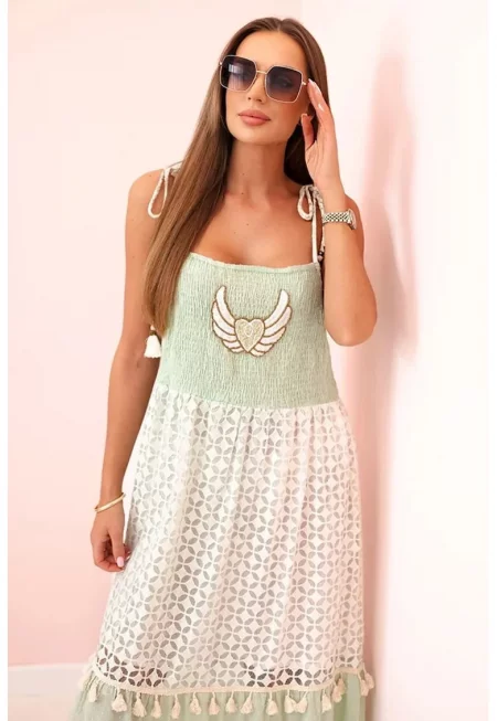 Дълга рокля с пискюли и дантелен модел -