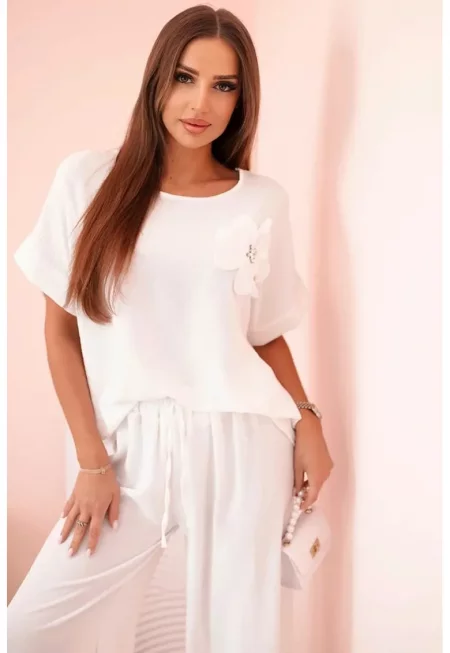 Комплект блуза с къс ръкав и флорален детайл и панталон -