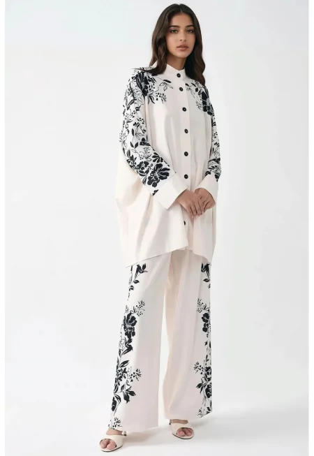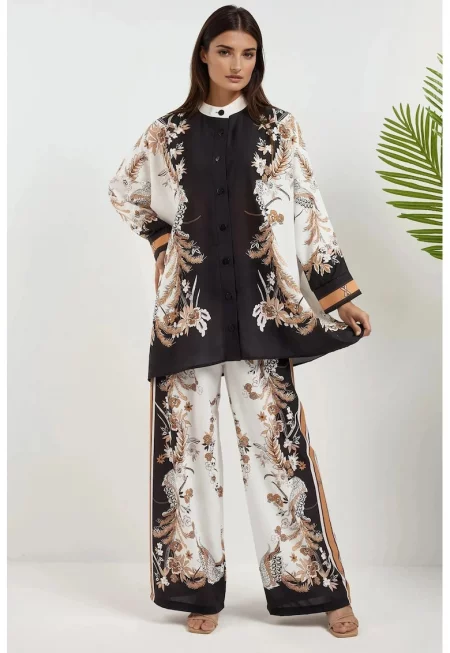Комплект от две части - флорална яка - висока талия - черен - текстил
