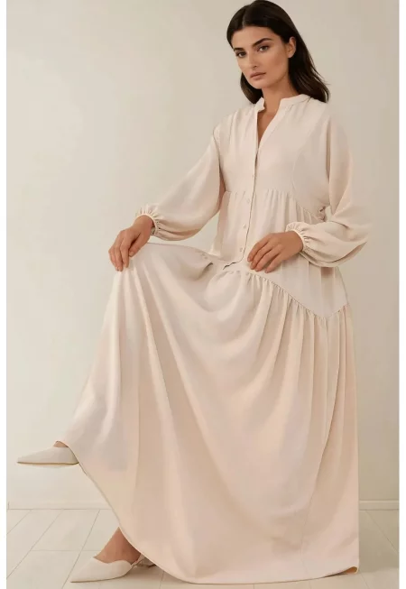Макси рокля - текстурирана - V-образно деколте - бежова - текстил