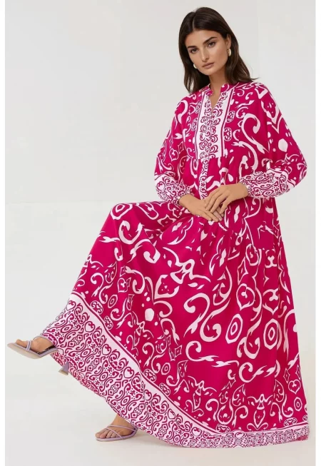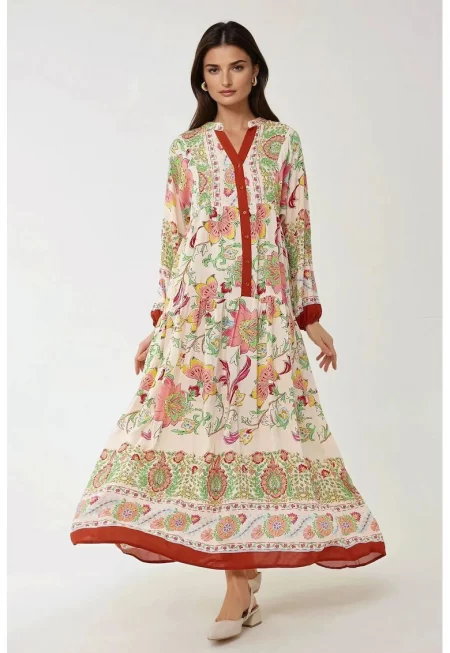 Макси рокля вискоза - щампа - многоцветна - дълъг ръкав -