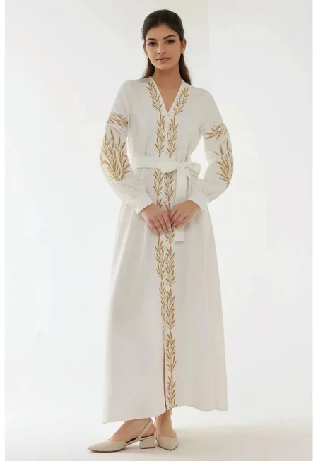Рокля V-образно деколте - бродерия - бяла - текстил