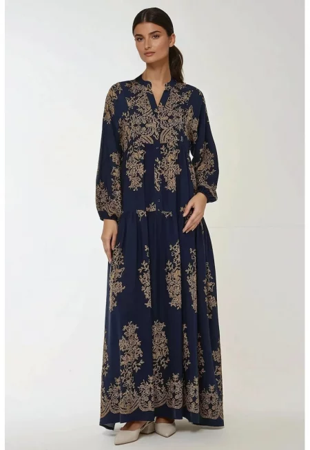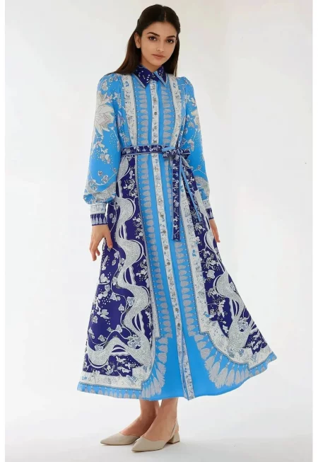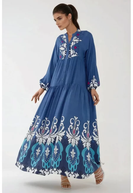 Макси рокля дълъг ръкав - щампа - синьо/бяло - вискоза