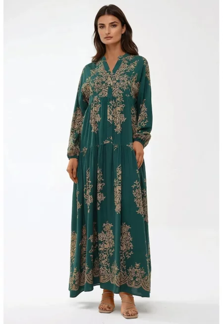 Макси рокля щампа - дълъг ръкав - зелена - вискоза