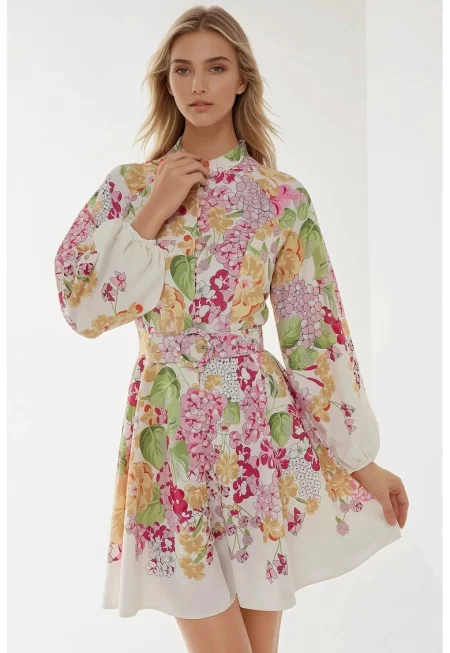 Мини рокля - щампа - колан - многоцветна - тънка материя