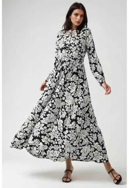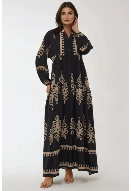 Макси рокля - щампа - с яка тип риза - черна - фабрика