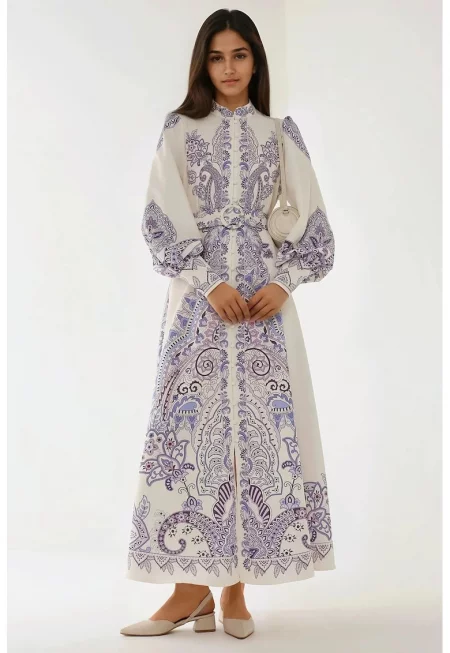 Макси рокля - щампа - дълъг ръкав - многоцветна - текстил
