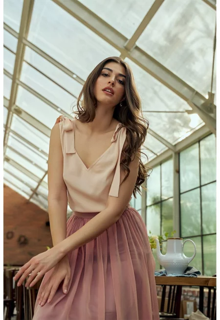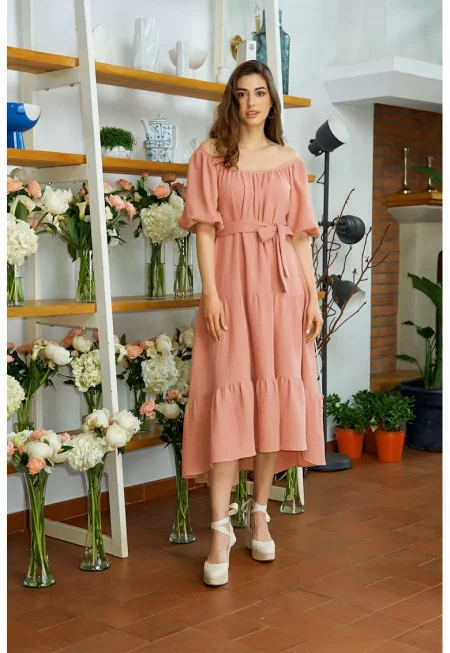 Рокля Cassia с голо рамо и асиметричен подгъв - Розова сьомга