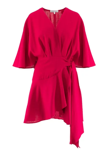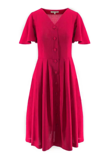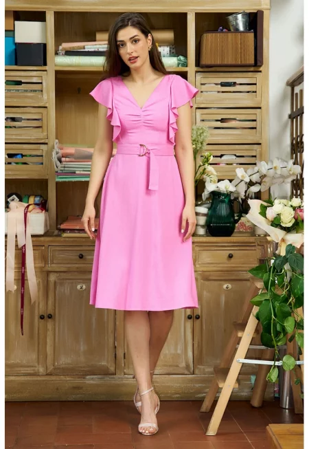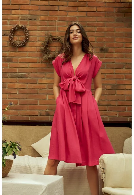 Рокля с лен Clarisse с панделка отпред - Фуксия