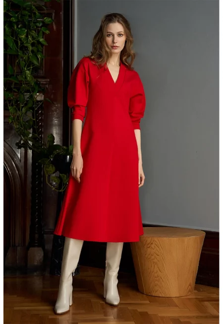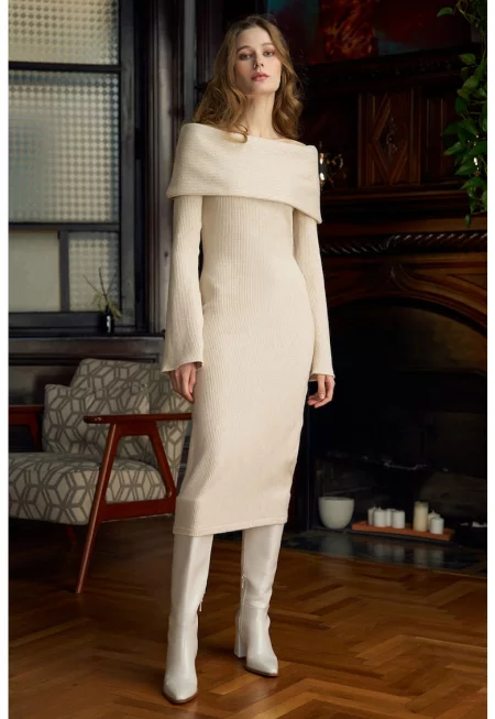 Разкроена миди рокля с набрани ръкави и шпиц - Слонова кост