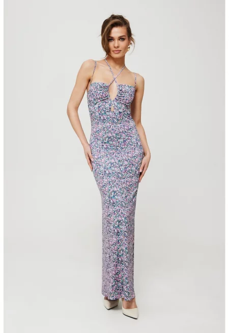 Дамска макси рокля с щампа и връзка на врата - полиестер - черна'
