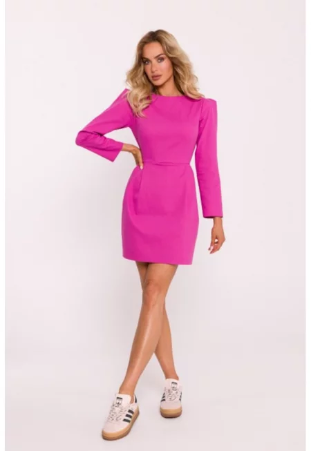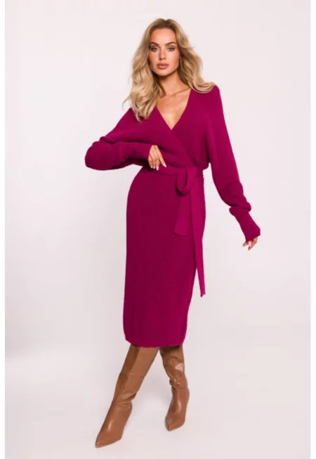 Плетена рокля с браздирано деколте и колан - розово - един размер