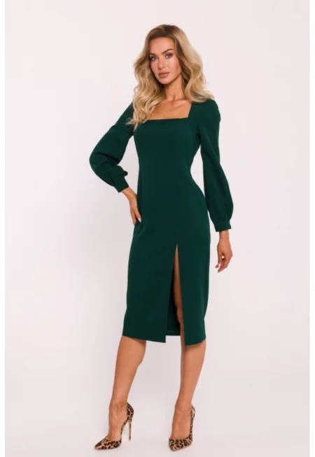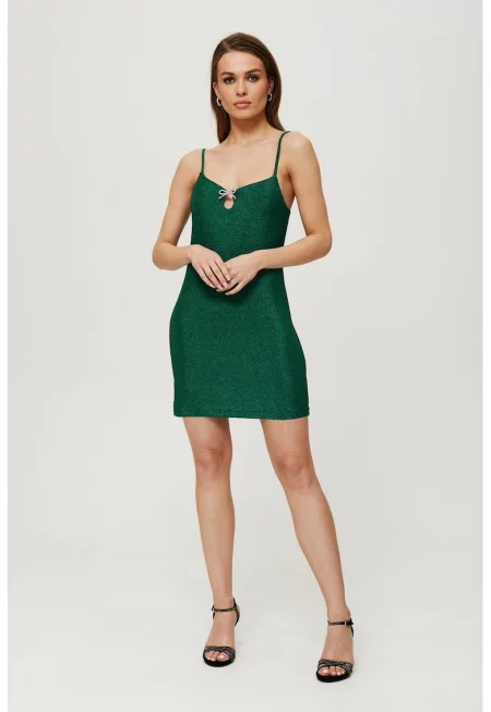 Дамска рокля - метална макси с вратовръзка - полиестер - зелена