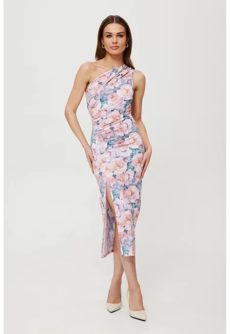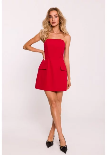 Дамска рокля - с волани на едното рамо - Полиестер - Червена