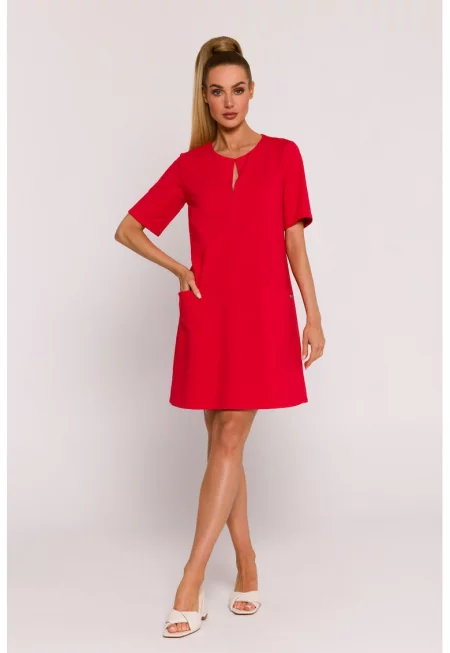 Дамска рокля - трапецовидна с джобове - Полиестер - Червена