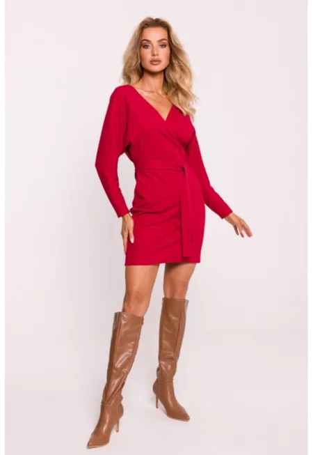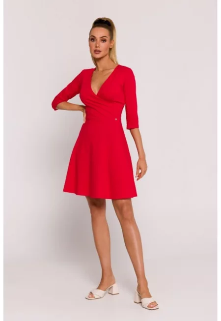 Дамска рокля - със застъпваща се горна част - Полиестер - Червена