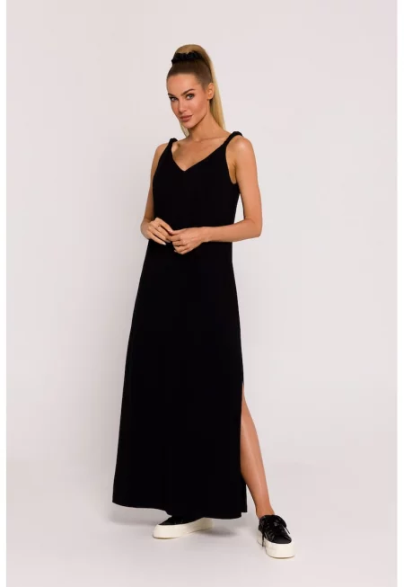 Дамска рокля - трапецовидна с джобове - Полиестер - Черна