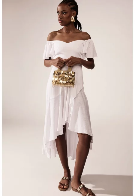 Дълга рокля от лен и памук с многоцветна бродерия Sahara - Крем