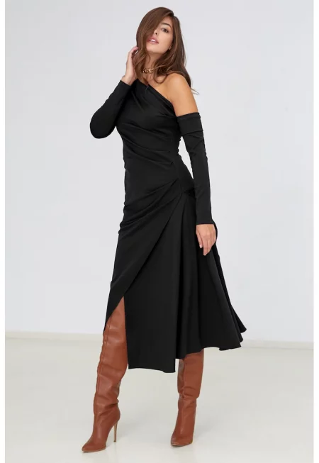 Миди рокля от памук и лен Nerisa - черно и бежово