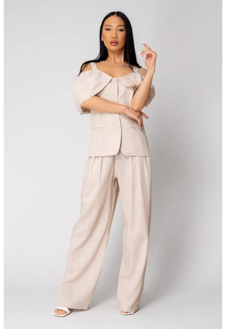 Комплект яке с открити рамене и дълъг панталон Бежов 16633