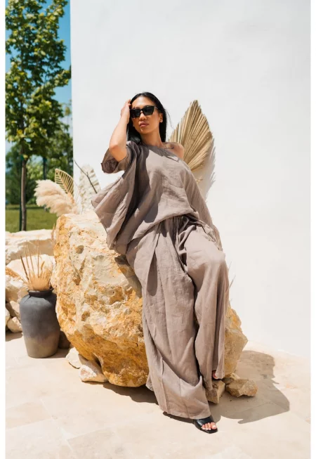 Комплект от ленена блуза и дълъг панталон - бежов 17673