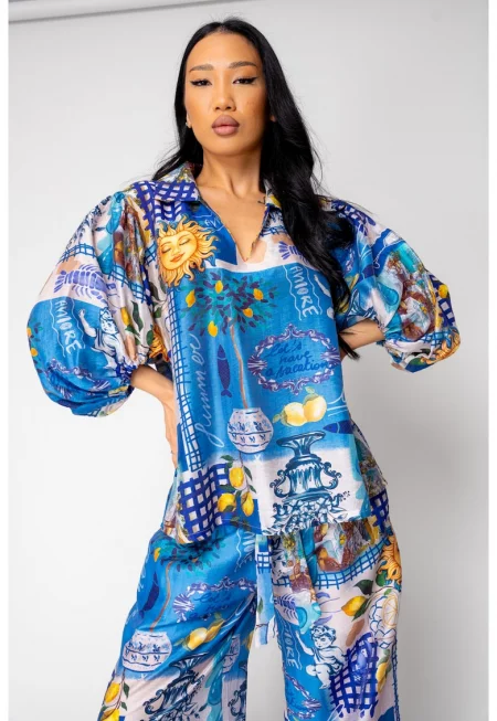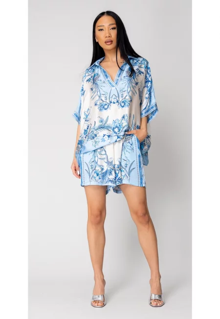 Комплект Shells блуза и къс панталон от копринен микс Off White/Blue 16392