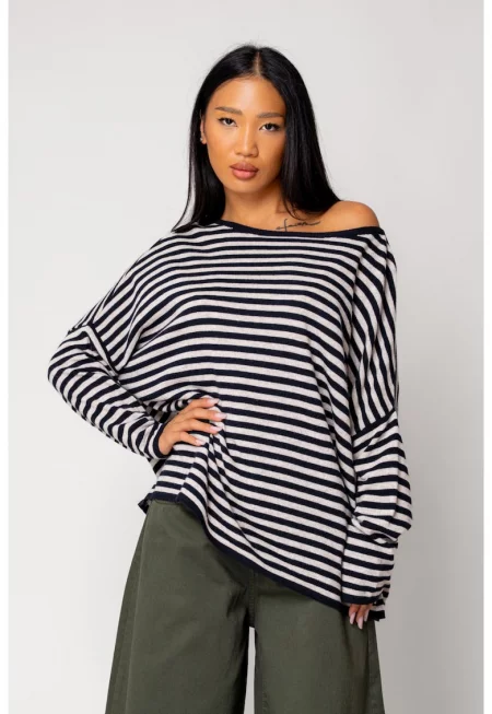 Пуловер на райета от смес от вълна и кашмир Бежов/Тъмносин 18059