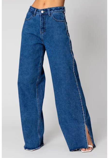 Широки дънки от деним с кристали в синьо 16342