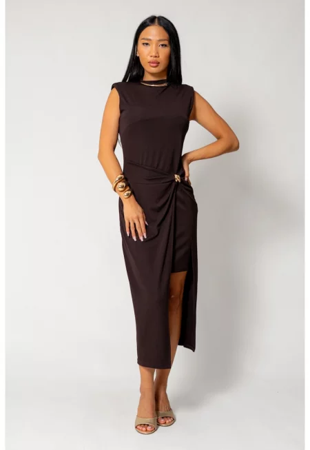 Миди рокля с декоративен пръстен Кафява 18290