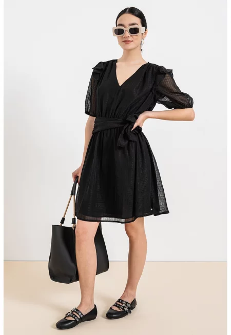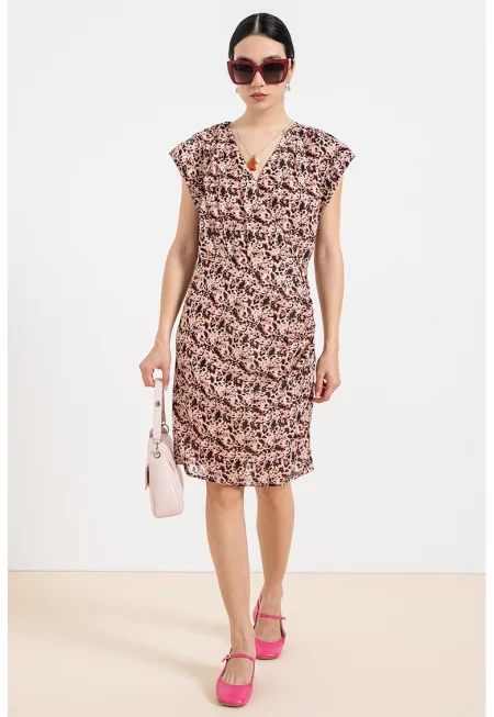 Рокля с шпиц и абстрактен принт - Тъмновиолетов/Мръснобял