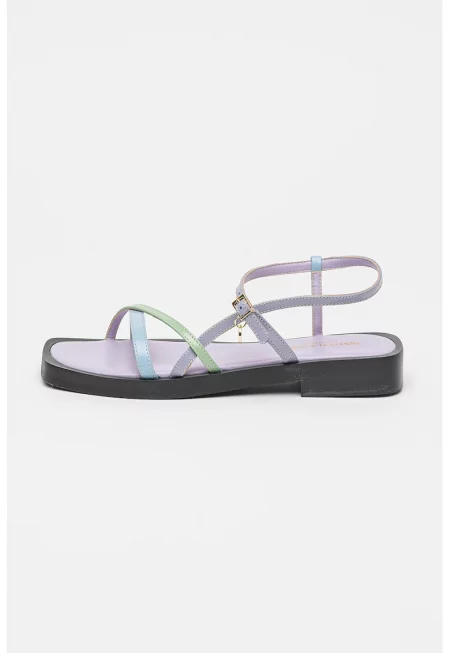 Кожени сандали с квадратен връх - Лилав/Светлозелен