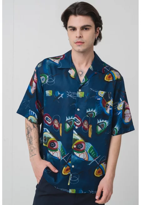 Риза от лиосел с джоб и принт - Зелен/Тъмносин