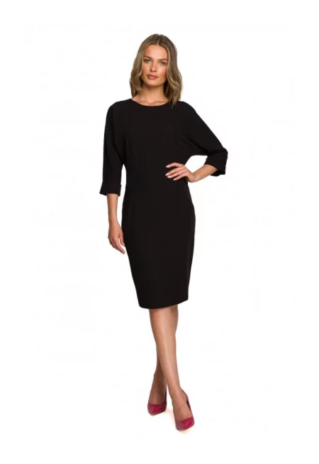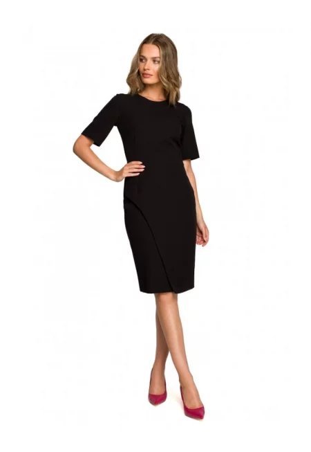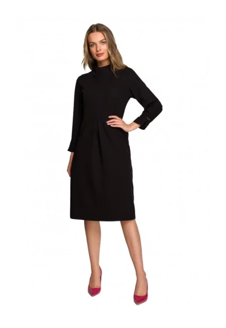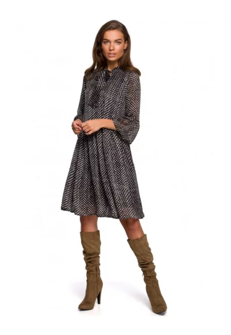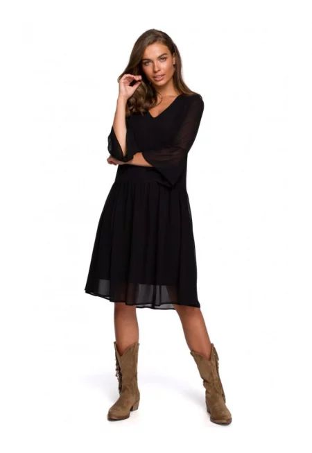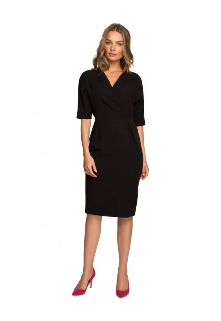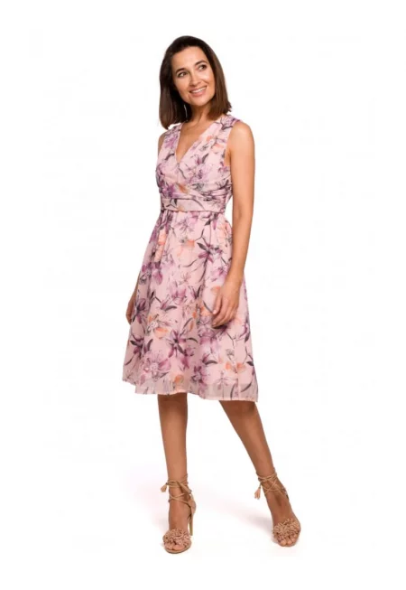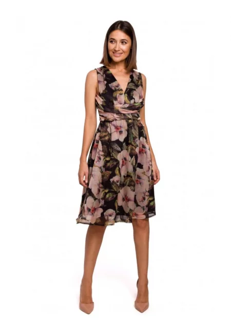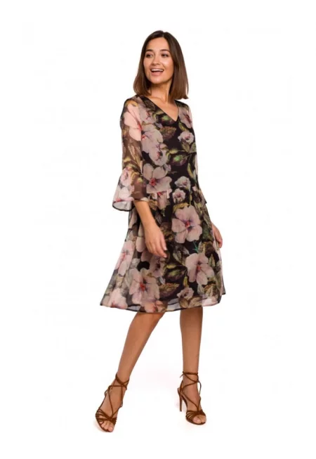 Рокля с деколте и флорален модел - стил - полиестер - черно/розово