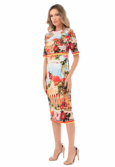 Десенирана рокля с цепка на гърба - Червен/Зелен/Пастелносин