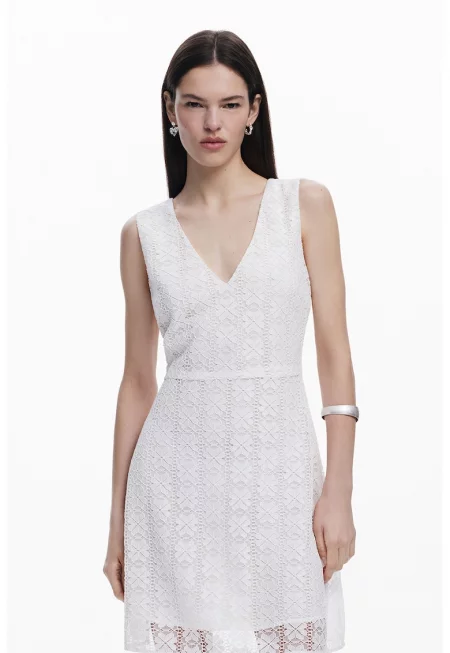 Флорална къса рокля с флорална дантела - Мръснобял