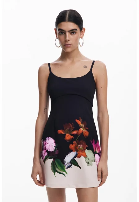 Флорална къса рокля с флорална дантела - Черен