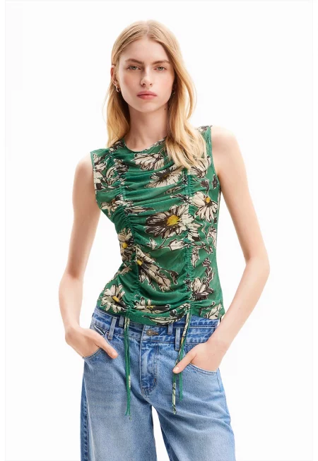 Флорален топ с набран дизайн - Зелен/Крем