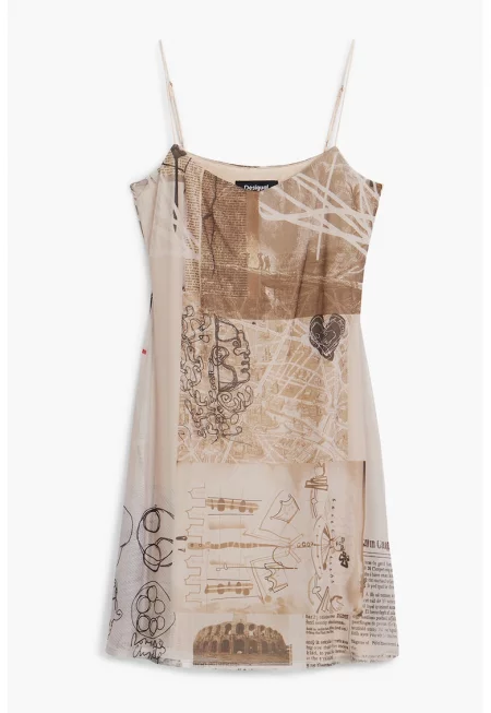 Къса рокля с десен и тънки презрамки - Черен/Бежов