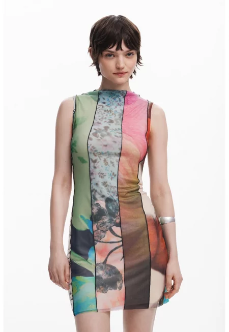 Къса права рокля с овално деколте - Многоцветен