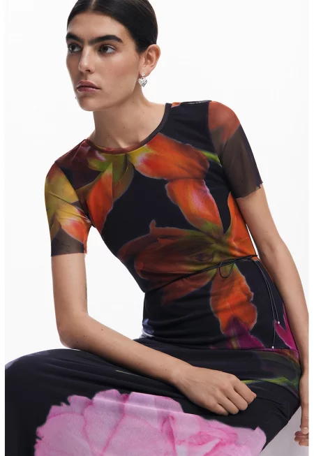 Флорална рокля с къси ръкави - Зелен/Черен/Оранжев